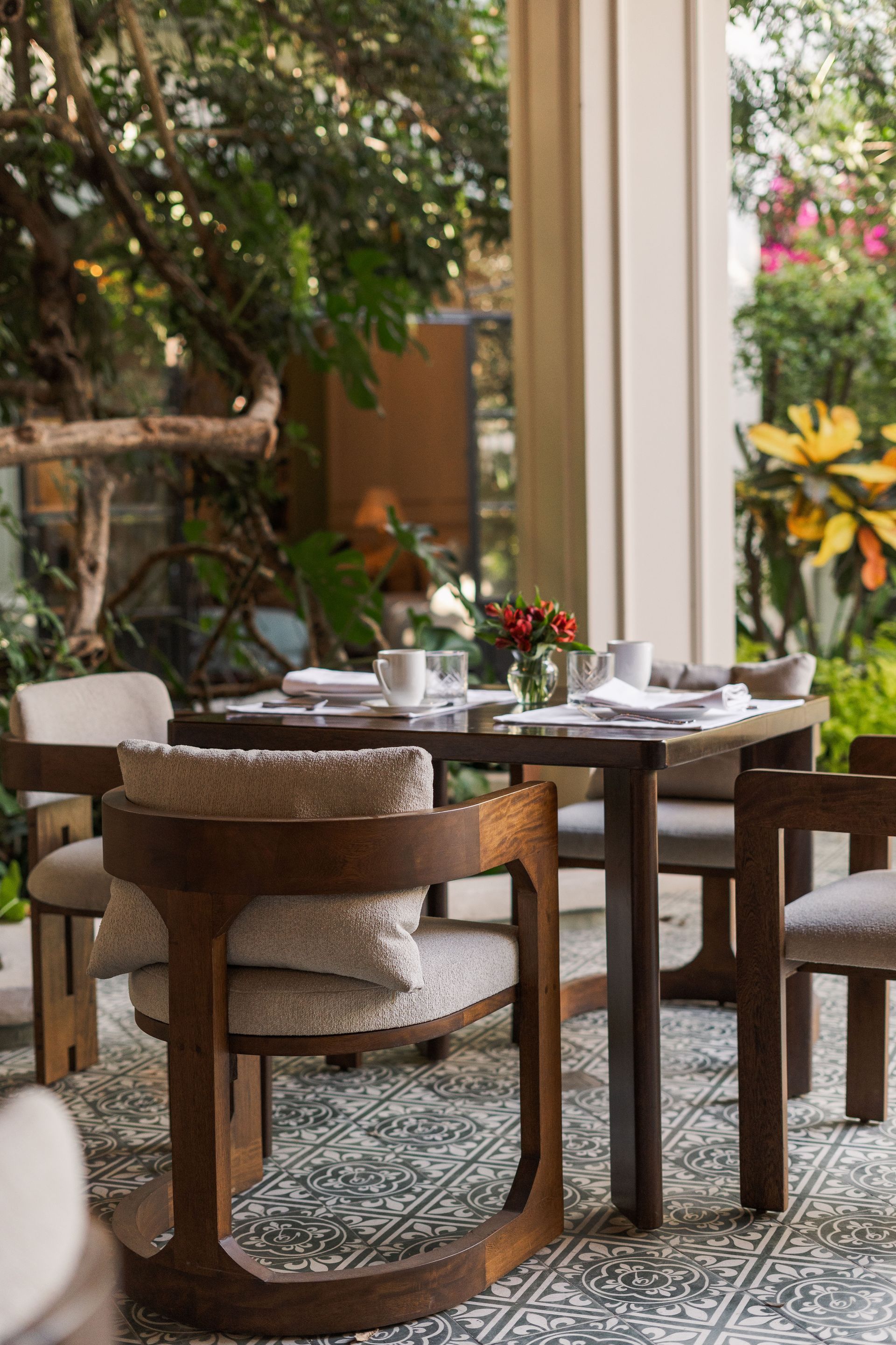 Breakfast, lunch, and dinner are served continuously, with the flexibility that a home allows. Weather permitting, the garden becomes the dining room. Indoors, the light settles softly over the tables and the pace slows. The intention is simple: to cook well, serve attentively, and let conversation unfold naturally.